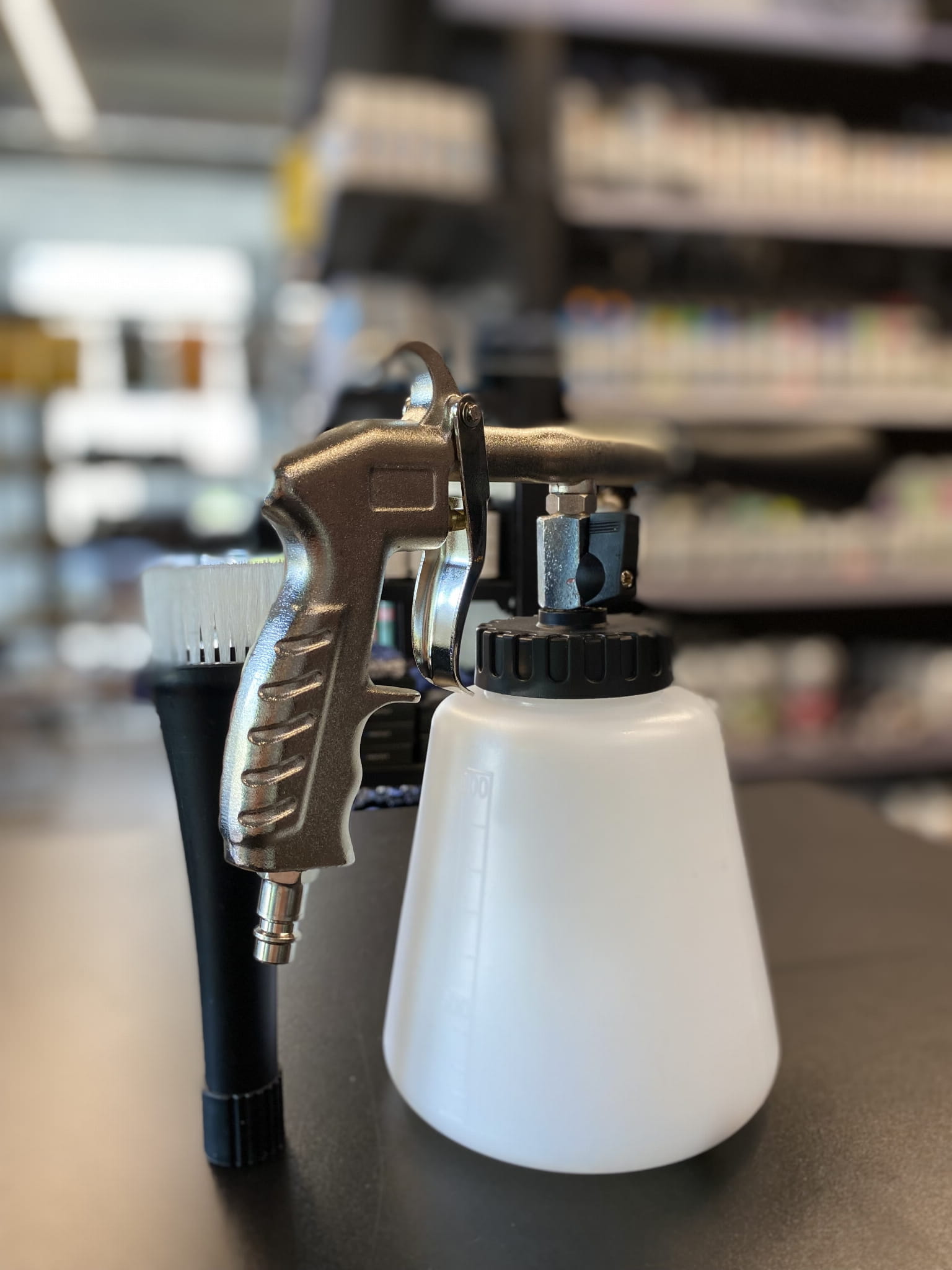 Wysokiej jakości pneumatyczny pistolet z aluminiową obrotową dyszą czyszczącą, przeznaczony do prania wszelkiego typu tapicerek samochodowych, dywaników, mebli, plastików, felg, elementów lustrzanych, wylotów powietrza i wielu innych rzeczy. Dzięki swojej konstrukcji myje powierzchnię minimalnie ją namaczając. Dzięki profesjonalnej metalowej konstrukcji dyszy zapewnia najlepszą jakość czyszczenia ze wszystkich dostępnych pistoletów.